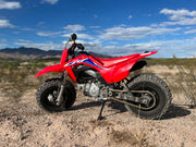 The wheelbase is increased slightly. (Longer swingarm and offset Triple clamps, and seat height roughly 1.5” taller depending on shock and spring. This is a great setup for adult fun bike - (((or for youth riders in soft terrain - sand - gravel etc where oem tires just don't cut it))) it really makes this bike feel planted. The big tires aired down to act like extra suspension as well.