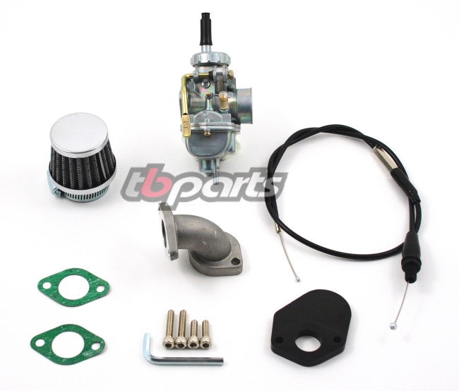 Kit includes the carb, intake for STOCK HEAD, heatstop, gaskets, mounting bolts/wrench, air filter and throttle cable (11/4 Update – a new type cable is provided that allows for more adjustments and will work on wider selection of throttles). We highly recommend this carb kit for use with bore kits (70cc to 88cc). The airfilter in this kit is better suited for trail or street use.