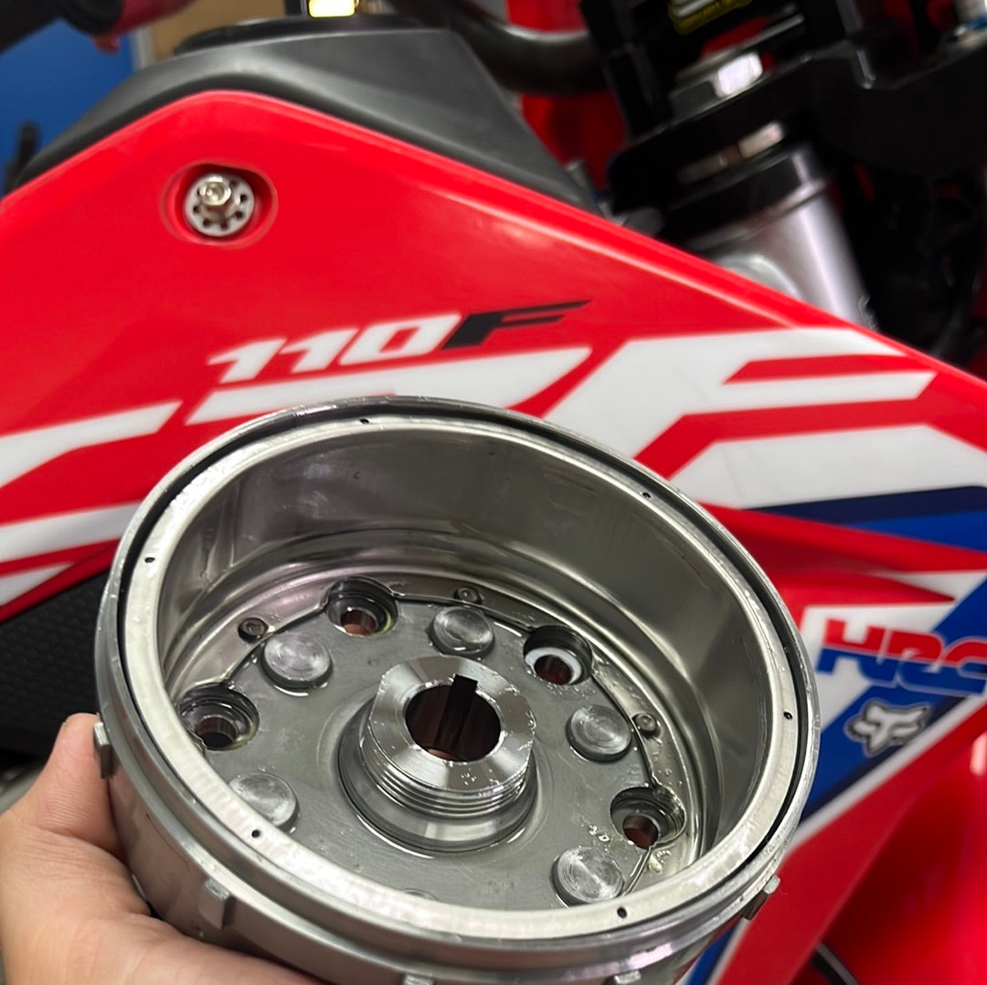 Honda CRF110F lightweight flywheel eliminates rotating mass from the crankshaft, allowing the bike to rev up much quicker.