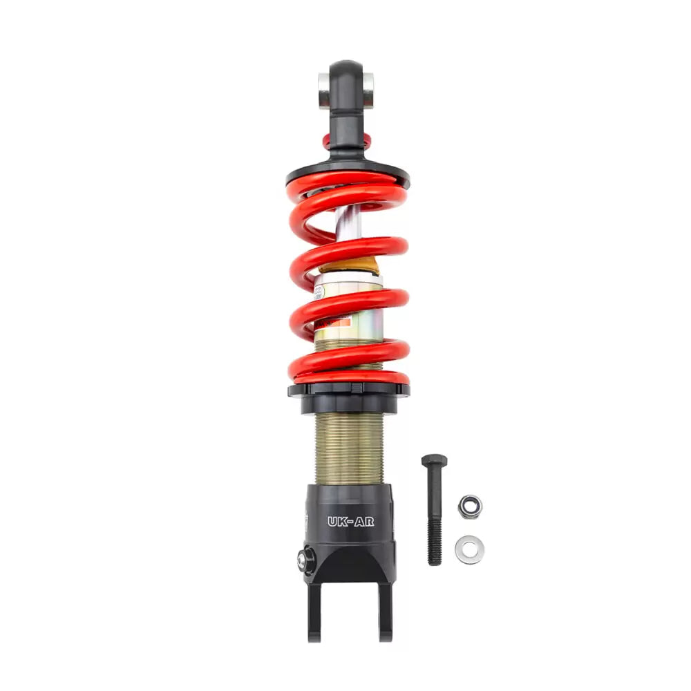 DNM Heavy duty rear shock for CRF125. This shock is a huge improvement over the factory shock for adult riders. It is sprung much heavier with a 700# spring and it has adjustable rebound. Bolt on perfect fit!