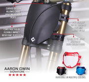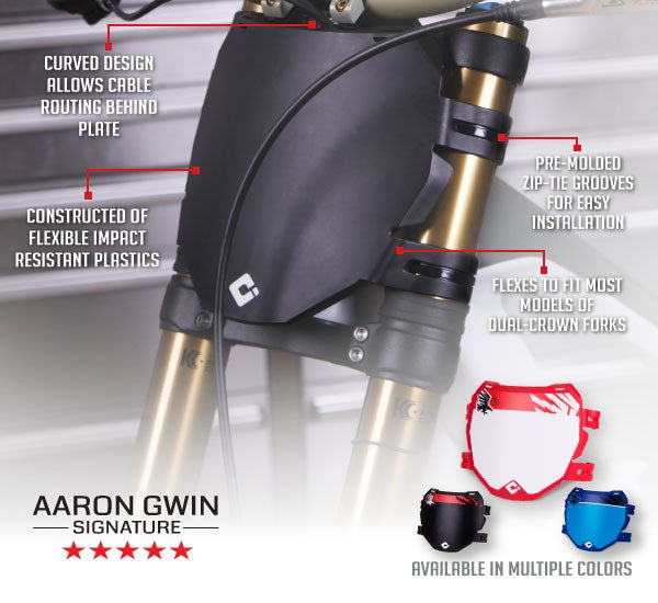 - Durable but flexible fiber reinforced polymer construction allows plate to easily flex to fit onto fork stantion tubes where pre configured zip-tie groves make installation simple