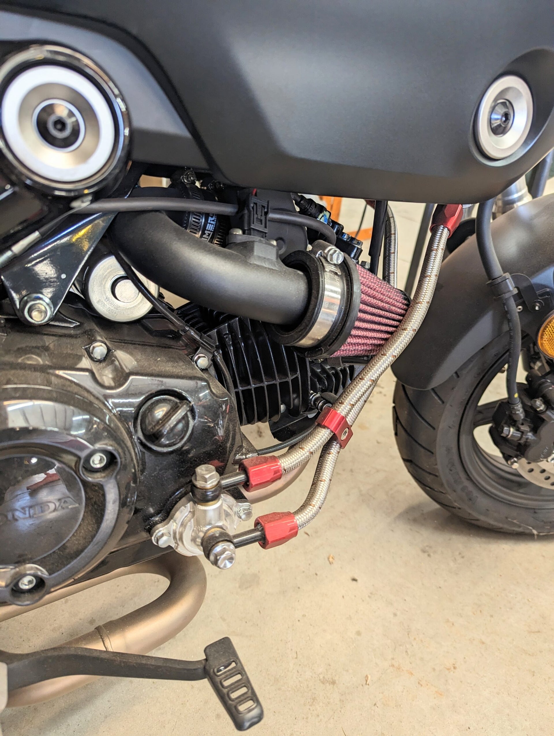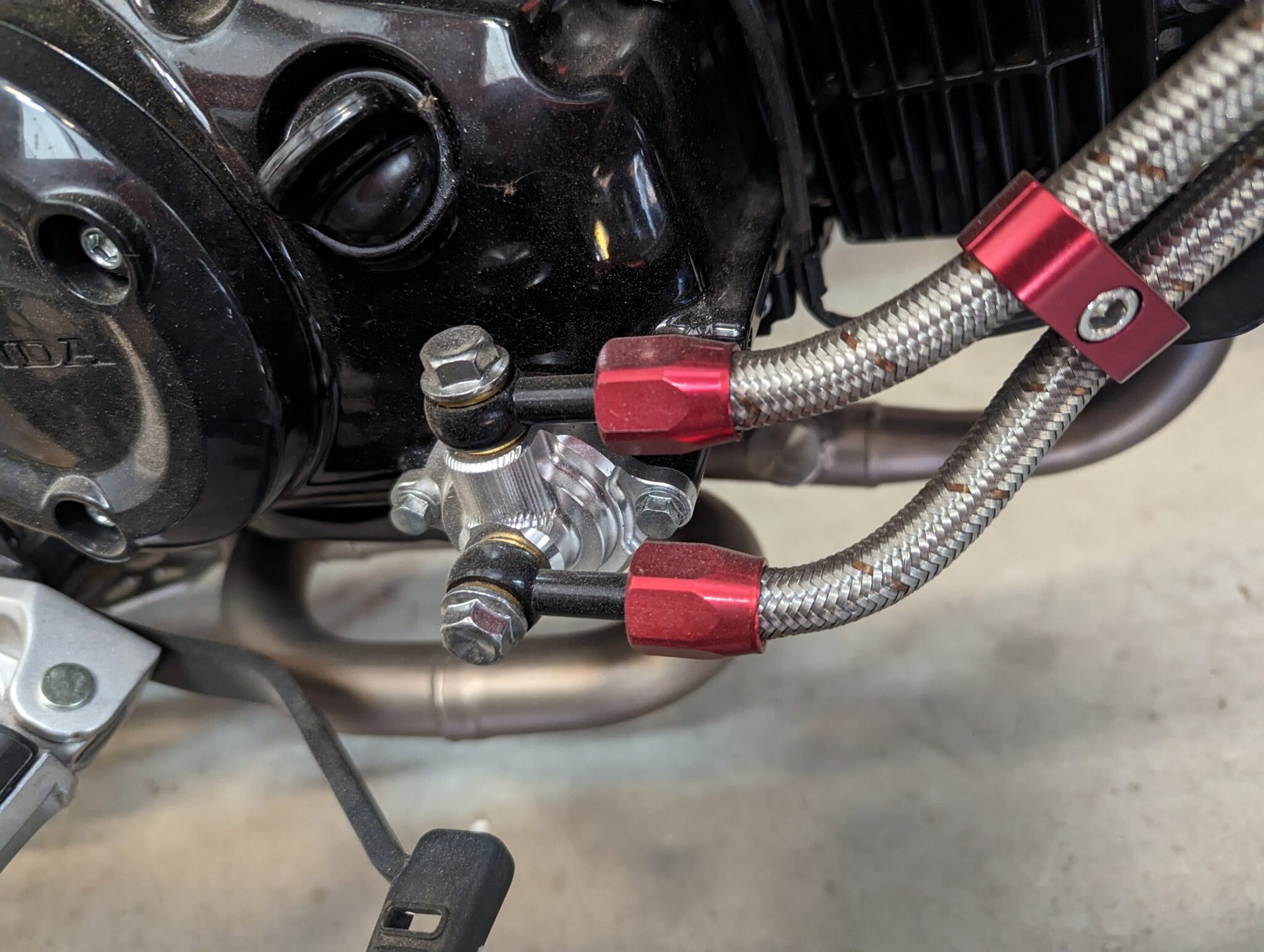 The Morin Racing Oil Cooler Kit for the Honda Grom (and MSX125) is a high quality accessory designed to help the Honda horizontal engine run cooler. Air-cooled engines run hotter when modified (i.e. big bore kits), subjected to heavy loads, or used for racing. This kit will help the engine’s durability and reliability by circulating the engine oil through a cooler reducing the engine’s oil temperature. The kit includes the following: