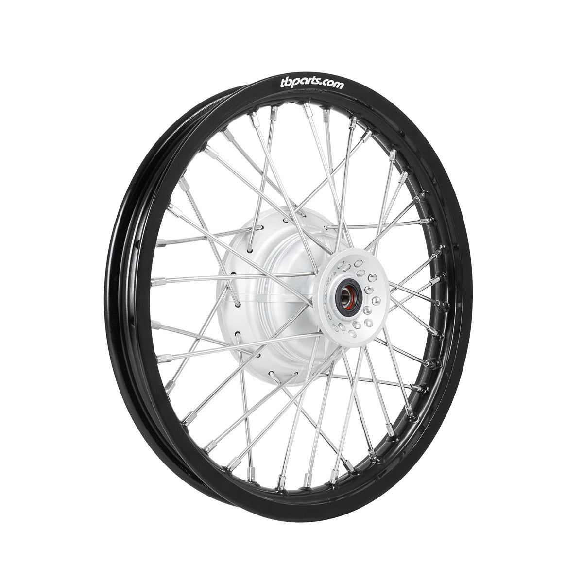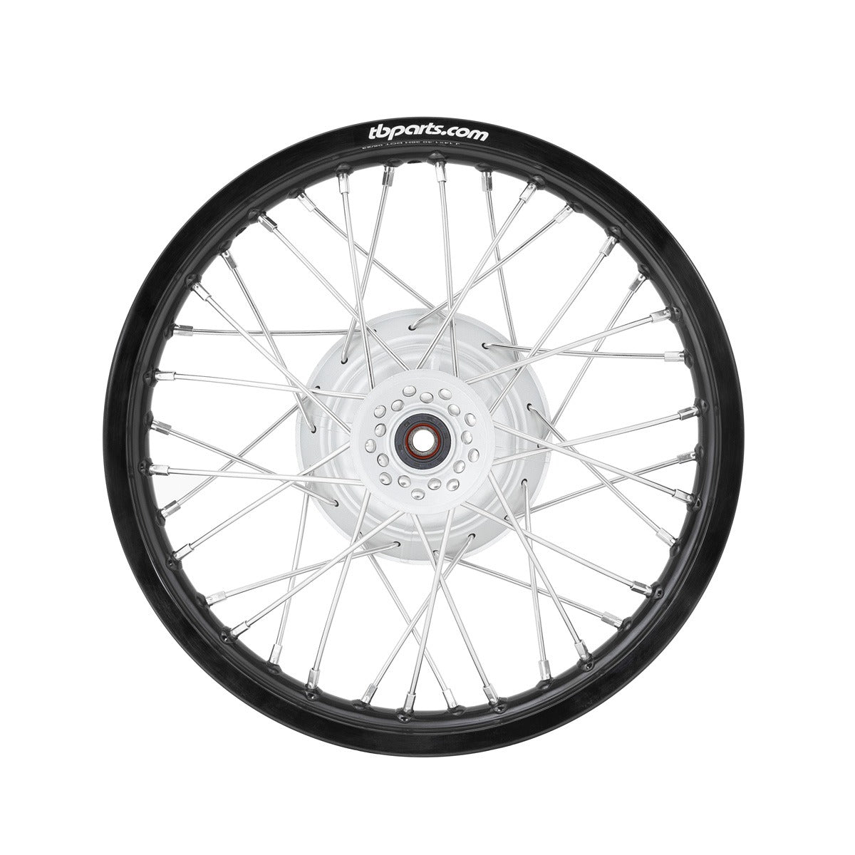 After seeing many aggressive riders tear apart CRF110 wheels racing them on mini MX tracks we wanted to bring a new high quality and affordable option to the market. So, our wheels come ready to run from bearings to the rim! Starting out we had the factory install quality NTN bearings with the proper spacer behind/between them. Next is our OEM style, “bolt in place”, cast aluminum hub painted in silver to match the OEM brake panel (our TB logo is also cast in). For added strength we used stiffer/harder Stainless Steel spokes that are weather resistant compared to the basic steel OEM spokes. Wrapping up the complete wheel is the aircraft grade 7050 aluminum rims in satin black with the TBparts.com logo! The black rims look great once installed! These are lighter, stronger, and more weather resistant than the factory steel rims. Not to mention ours come laced saving you a ton of time and hassle! An OEM pair of wheels like this will set you back over $770!!! The value these offer is unmatched!