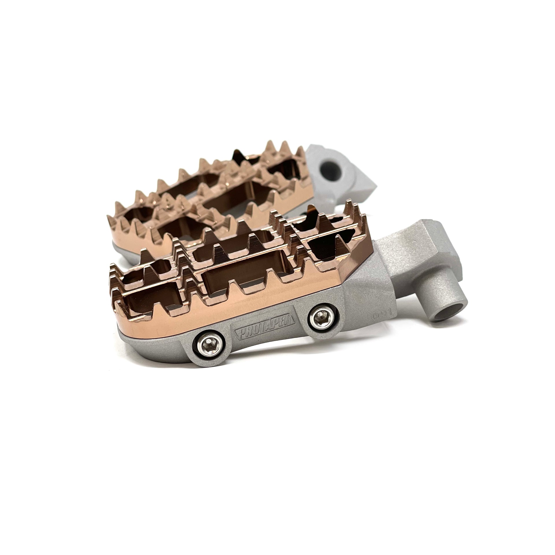 Stainless steel cleats with superior wear resistance in a 2-piece platform system. 7075 hard-anodized billet aluminum replaceable cleats. Precision investment-cast stainless steel platform base. Exclusive ProTaper traction arch cleat design.