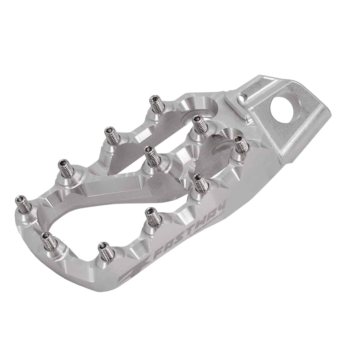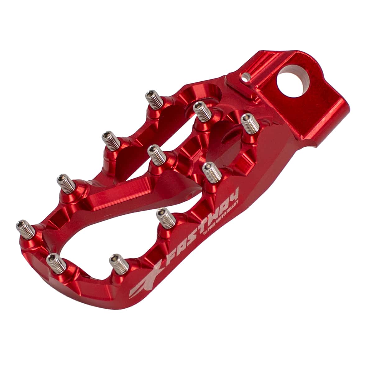 The Fastway Footpegs are light, strong, fully adjustable, and precision engineered for the best ride, every ride! Machined In-House from U.S. Made 2024 billet aluminum which is Stronger and less brittle than 6061 Aluminum. The Fastway Foot Pegs are designed with slanted drafts to shed mud and debris while being ultra-strong. The traction surface has been modified to ensure the rider’s sole rests entirely on the cleats. Offering more available traction due to additional cleat on platform and measuring 2.25” front to back by 4.0” wide means the Fastway Foot Pegs are the perfect balance of size and traction for Motocross, Off-Road, and weekend warriors alike.